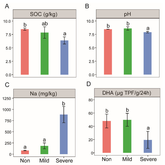 SOC contents (A), pH (B), Na contents (C) and dehydrogenase activities (D) of the soils with three salinity levels: Non–salinity, Mild–salinity and Severe–salinity. Different letters above bars denote significant differences (p < 0.05) among salinity levels.