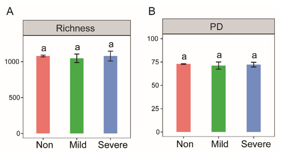 Bacterial diversity indices of the soils with three salinity levels: Non–salinity, Mild–salinity and Severe–salinity. The diversity index Richness denotes the bacterial variations at the taxonomic level (A), and PD (phylogenetic diversity) denotes variations at the phylogenetic level (B), in other words, evolutionary relationship. The same letters above bars denote no significant difference (p > 0.05) among salinity levels.
