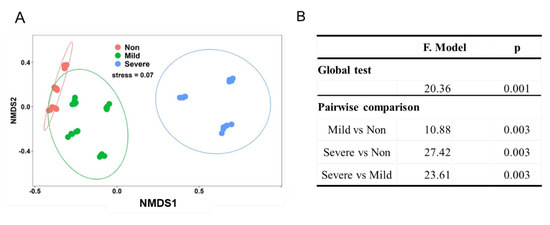 Nonmetric multidimensional scaling (NMDS) plot of bacterial community in the soils with three salinity levels: Non−salinity, Mild−salinity and Severe−salinity. Plot (A) depicts the Bray–Curtis distance and PERMANOVA with a global test and pairwise comparison (B) shows Bray–Curtis distance−based dissimilarity of the bacterial community in the soils with three salinity levels.