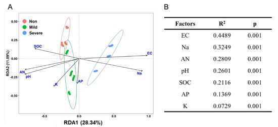 Nonmetric multidimensional scaling analyses (NMDS) revealed that soil samples formed distinct clusters in the ordination space based on Bray–Curtis distance (Figure 3A), with significant differences at taxonomic levels (PERMANOVA) (Figure 3B). It is obvious that Non– and Mild–salinity soils were clustered close and they were distant from the cluster of Severe–salinity soils. We can conclude that soil salinity significantly influenced the composition of the bacterial community, which was also confirmed in ordination analysis (Figure 4A) and Mantel test (Figure 4B). From redundancy analysis, we found approximately 80.32% of the total variation in the soil bacterial community composition with the first two components explained 39.43% (Figure 4A). The effects of EC and Na on bacterial community were opposite to that of SOC, AN and pH. Mantel test showed that EC was the major driver of a shift in bacterial community composition, explaining 44.89% of the variation (p = 0.001, Figure 4B).