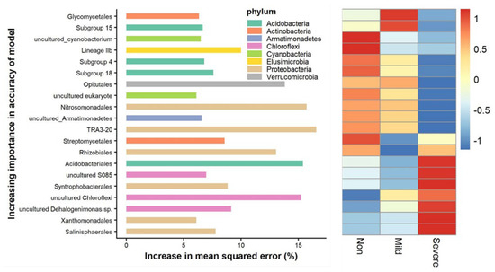 Random forest (RF) means predictor importance (percentage of increase in mean square error) of microbial species at order level and the corresponding relative abundances (z–score transformed) of the soils with three salinity levels: Non–salinity, Mild–salinity and Severe–salinity. The accuracy importance of the model was computed for each tree and averaged over the forest (1000 trees). Percentage increases in the mean squared error (MSE) of variables were used to estimate the importance of these predictors, and higher values indicate more important predictors. Heatmap showed the variations in the relative abundances of these top 20 predictive biomarker taxa among three salinity soils.