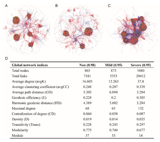 Bacterial network associations (A: Non–salinity; B: Mild–salinity, C: Severe–salinity) and topological properties of bacterial molecular ecological networks (D) of soils with three salinity levels. Network plots were drawn based on random matrix theory (RMT) analysis from OTU profiles. Red and blue lines respectively represent negative and position correlations between nodes. The size of each node is proportional to the number of connections with other nodes in the network.