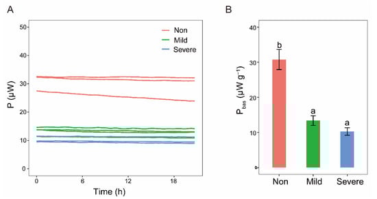 Recorded power–time curves of basal heat release were almost parallel to the x–axis (Figure 7A), indicating that microbial activities were relatively stable when microorganisms were in the state of maintenance without substrates amendment. The basal heat release curves visually reflected that microbial metabolic activity in the soils with three salinity levels had an order of Non–salinity > Mild–salinity > Severe–salinity (Figure 7A). Analysis of one–way ANOVA further indicated that basal heat release of Non–salinity soil was significantly higher than that of Mild–salinity soil and Severe–salinity soil (Figure 7B, p < 0.05).