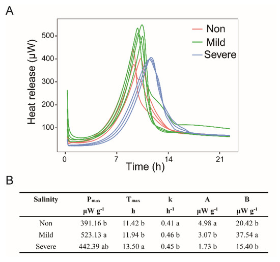 Substrate induced heat release curves (A) and microbial characteristics of growth response with three salinity levels (B): Non–salinity, Mild–salinity and Severe–salinity. Different letters above bars denote significant differences (p < 0.05) among salinity levels. Pmax, the maximum heat flow rate; Tmax, the peak power time; k, the specific growth rate of the soil microbial community; A, the initial heat flow rate uncoupled from cell growth; B, the initial heat flow rate of the growing fraction coupled with cell growth.