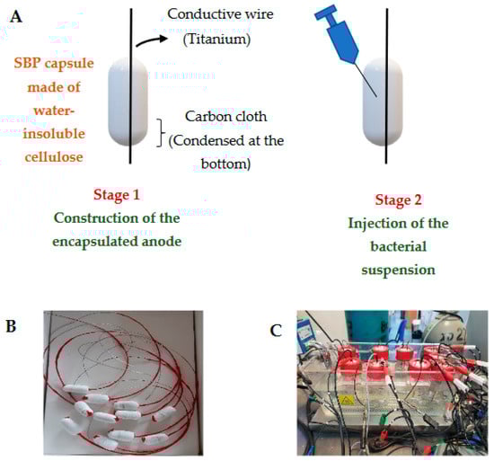 MEC based on the SBP anode. Scheme of the encapsulation anode preparation (A); Photo of the anode (B); MEC facilities with the encapsulated anode, based on the SBP technology (C).