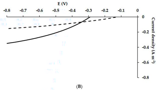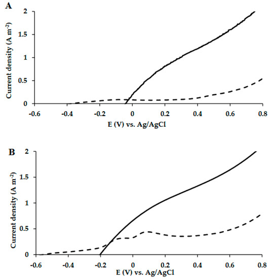 The MECs were fed with acetate as the carbon source for 32 days followed by artificial wastewater for another 46 days. In this second period, the artificial wastewater was replaced once a week and acetate was added twice a week. LSV measurements were performed at least once a week. LSV measurements on the 36th and 57th days of the MECs’ operation are shown in Figure 3A,B.