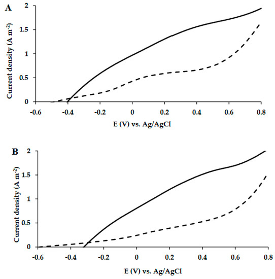 LSV polarization curves of MEC-SBP (—) and MEC control (- - -) supplied with Geobacter medium, and acetate as the sole carbon source. LSV analysis was carried out on the 14th (A) and 27th (B) days of the MECs’ operation, at a scan rate of 5 mV s−1 versus Ag/AgCl.