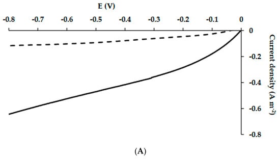 Reduction currents were measured at least once a week during the MECs’ operation, when the sole carbon source was acetate (Figure 4A), and when the MECs were fed with artificial wastewater (Figure 4B). The reduction current analyses were conducted when the MECs were in a configuration of a complete cell (two-electrode configuration).