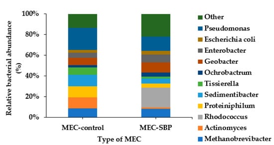 The microbial diversity on the MEC-SBP and MEC-control anodes was evaluated based on 16S rRNA at the end of the MECs’ operation (78 days). Operational taxonomic unit (OTU) readings were identified and phylogenetically classified. Five distinct phyla (Proteobacteria, Firmicutes, Bacteroidetes, Actinobacteria, and Euryarchaeota) were identified. The three most abundant phyla were Proteobacteria, Firmicutes, and Actinobacteria, with a relative distribution on the MEC-control anode of 32%, 32% and 14%, respectively. On the MEC-SBP anode, they were 40%, 15%, and 30%, respectively. Relative bacterial distribution with respect to the genus level of the anode biofilm is presented in Figure 8. Unidentified species or sequences with relative abundances of <2% were grouped as “Others/NA”.