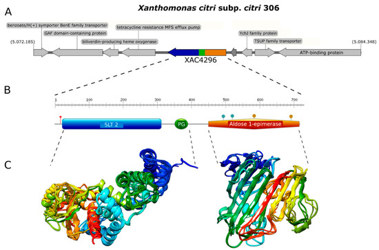 Genome context, protein domain, and structure of XAC4296. (A). Genome context of XAC4296 from X. citri genome. (B). Protein domain and structure of XAC4296. XAC4296 has 720 aa with the LT domain associated with 3B family: Transglycosylase SLT domain (SLT_2) (IPR031304.) and Peptidoglycan binding (PG_binding_1) (IPR002477) domains, and the Aldose 1-epimerase (IPR015443) domain. (C). Molecular modeling cartoon representation of the LT and epimerase XAC4296 domains.