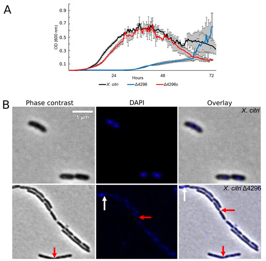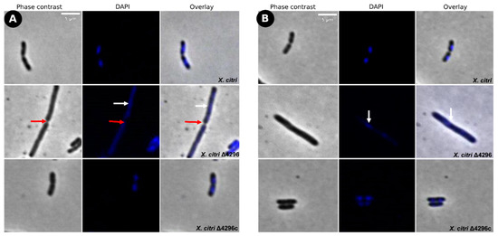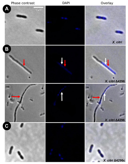 Different from the wild type, the Δ4296 mutant formed chains and sometimes a phenotype resembling short filaments, accompanied by irregular distribution of the chromosomal mass (Figure 3B, white arrows). The proportions of short filaments and chains measured in a given mutant culture were 30.6% and 15%, respectively (Table 3). Close inspection of the chains with clear septal constrictions (red arrows in Figure 3) showed no apparent nucleoid bisection. However, the Δ4296 mutant seems perfectly competent in chromosome segregation because many cells in a culture display normal nucleoid distribution (Figure 3B). However, in successive cellular cycles, errors in late cell division lead to the accumulation of chromosomal mass generated by subsequent events of replication. The short filaments morphotype that happened nearly twice as much as the chains could be caused by triggering the division error in an early stage of the cell cycle or converting chains into short filaments. At the moment, we cannot pinpoint which of these options is taking place. Finally, complementation of X. citri Δ4296 with pMAJIIc (Δ4296c) expressed from an ectopic site completely restored the wild-type phenotype (Figure 3C).
