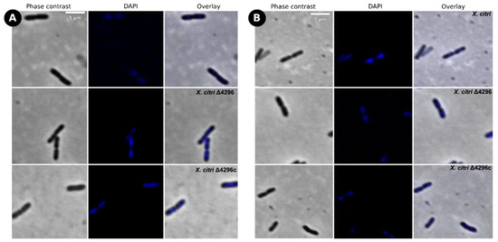 X. citri, Δ4296 mutant, and Δ4296c strains were cultivated in NB media until O.D. 600-nm reached around 0.3 ABS at 29 °C. We performed analysis in different conditions: with ampicillin (20 µg/mL), sucrose 2% (w/v) and glutamic acid 2% (w/v). For morphological analysis, strains were collected by centrifugation, and cells were resuspended in 0.85% NaCl. We used 4′,6-diamidino-2-phenylindole DAPI staining at a final concentration of 0.01% to visualize chromosome organization. Cultures were treated with propidium iodide (IP) for cell viability investigations at a 0.001 mg/mL final concentration. Cells were immobilized in agarose-covered slides for microscope observation [39]. We performed the assays three times and quantified cells individually (n = 800). Following treatments, cells were immediately visualized using an Olympus BX61 microscope equipped with a monochromatic camera OrcaFlash 2.8 (Hamamatsu, Japan). The software CellSens Version 11 (Olympus, Tokyo, Japan) was used for data collection and analysis.