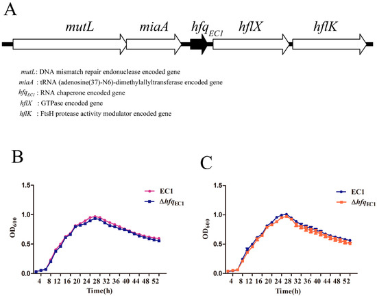 Gene organization of hfqEC1 and its influence on bacterial growth in Dickeya oryzae. (A) Gene organization of hfqEC1. Growth patterns of the wild-type strain EC1 and the hfqEC1 deletion mutant were measured in Luria–Bertani (LB) medium (B) and minimal medium (MM) (C).