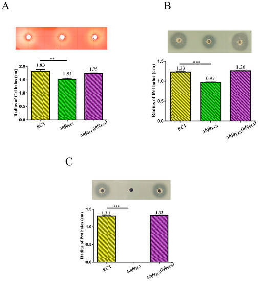 To elucidate whether hfqEC1 is responsible for the production of CWDEs in D. oryzae EC1, the production of CWDEs in wild-type strain EC1 and hfqEC1 mutant were compared with the agar plates with substrates of Pel, Cel, and Prt. The results showed that the production of Cel and Pel in the hfqEC1 mutant decreased by 17% and 21%, respectively, compared with those in wild-type strain EC1 (Figure 2A,B). Notably, inactivation of hfqEC1 totally abolished the production of Prt in D. oryzae EC1 (Figure 2C). The complementation analysis showed that in trans expression of hfqEC1 could restore the production of all these three types of CWDEs (Figure 2A–C). These results indicate that the HfqEC1 is required for the production of CWDEs in D. oryzae EC1, especially Prt.