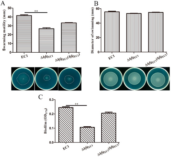 To elucidate whether HfqEC1 play key roles in motility and biofilm formation in D. oryzae EC1, the motility and biofilm-forming capacity of wild-type strain EC1 and the hfqEC1 deletion mutant were compared. The result showed that the ΔhfqEC1 displayed a comparable swimming motility but a decreased swarming motility compared with the wild-type strain EC1 (Figure 3A,B). Consistently, the crystal violet staining assay performed in the 96-well plates revealed that the biofilm formation in the hfqEC1 mutant represented a significant decrease compared with that in wild-type strain EC1 (Figure 3C). All these results indicate that HfqEC1 contributes to the regulation of swarming motility and biofilm formation in D. oryzae EC1.