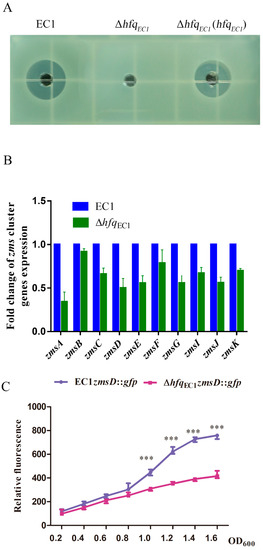 Expression of the zms cluster genes in Dickeya oryzae EC1 is regulated by HfqEC1. (A) Zeamine production assay. The filter-sterilized bacterial supernatants of D. oryzae EC1 and its derivatives were added to the wells in the bioassay plates, respectively. The bioassay plates were incubated at 37 °C for 24 h before photography. Experiments were repeated at least three times in triplicates. (B) QRT-PCR assay reveals the transcriptional regulation of key zms cluster genes by HfqEC1. (C) GFP promoter reporter fusion assay shows the regulation of zmsD gene by HfqEC1. Experiments were individually performed at least three times in triplicates. *** p < 0.01.