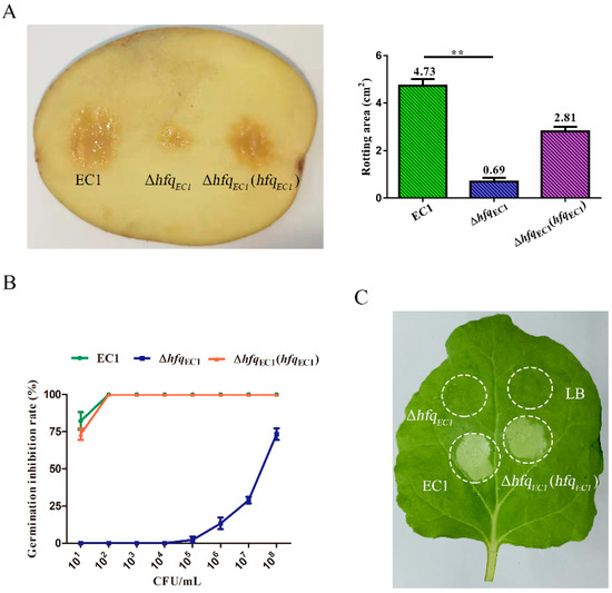 HfqEC1 is required for the virulence and hypersensitive response (HR) in Dickeya oryzae EC1. (A) Disease symptoms (left) and the rotting areas (right) on potato tubers inoculated with wild-type strain EC1, hfqEC1 mutant, and complementation strain of hfqEC1 mutant. Photograph was taken 2 d after inoculation. The numbers at the top of each column show the average rotting area ± SD from three repeats. ** p < 0.01. (B) Analysis of the capacity of D. oryzae EC1 in inhibiting rice seed germination. Rice seeds were treated with different bacterial dilutions as indicated and incubated at 28 °C for 7 days. Experiments were individually performed at least three times in triplicate. (C) The hypersensitive response induced by wild-type strain EC1, hfqEC1 mutant, and complementation strain of hfqEC1 mutant on leaves of Nicotiana benthamiana. An aliquot of 5 μL of bacterial cell cultures (OD600 = 0.05, 2.0 × 104 CFU/mL) was inoculated. The photograph was taken 24 h after infiltration.