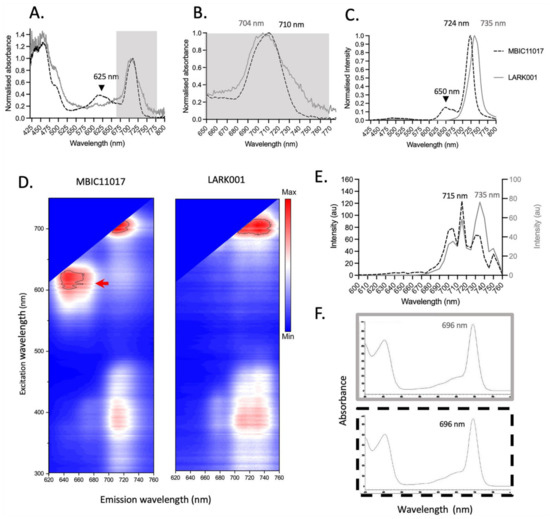 Absorbance spectra and fluorescence spectra of A. marina MBIC11017 vs. A. marina LARK001 grown in NIR. (A) Absorption spectra of both strains indicate differences between the two stains. At 625 nm (black arrow), a peak is present in the MBIC11017 strain that is not present in the LARK001 strain. Differences in the Chl d absorption region are also present (grey boxed region). (B) The grey boxed region from Panel A is magnified to further highlight the difference in peak Chl d absorption—704 nm for LARK001 and 710 nm for MBIC11017. (C) The emission profiles for each strain reveal a peak at 650 nm (black arrow) that is unique in the MBIC11017 strain, whilst the Chl d emission peaks differ substantially, with the peaks at 724 nm and 735 nm for MBIC11017 and at 735 nm for LARK001 strain. (D) An excitation emission matrix shows a unique spectral component (excitation max. approx. 625 nm and emission max. approx. 640 nm) in the MBIC11017 strain. The LARK001 strain exhibits two distinct emission profiles for Chl d at 718 nm (approx.) and 735 nm (approx.). Only one emission profile at approx. 718 nm is evident for the MBIC11017 strain. (E) Hyperspectral confocal scan (top panel) confirms the evidence of two emission peaks in LARK001, with the 735 nm peak being the major contributor in this strain. The same two peaks are evident in the MBIC11017 strain, but the 715 nm peak is the major peak. (F) The grey and black dashed panels reveal no difference in the absorbance profiles in the Chl d fraction that was purified by HPLC for each strain.
