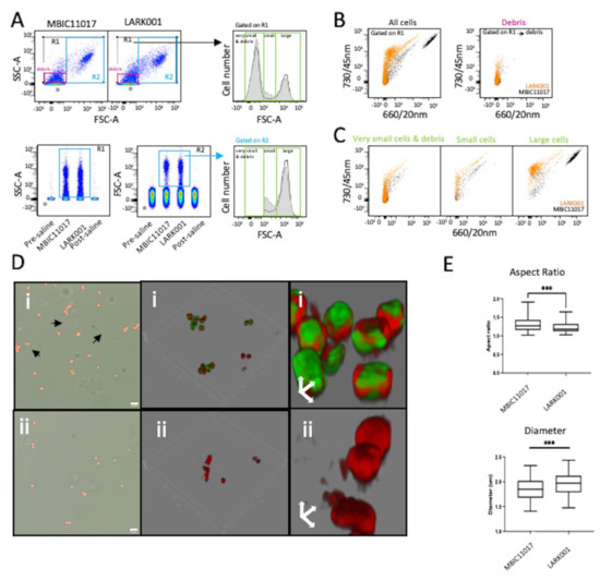 Finally, both the cytometry side scatter profiles and confocal imaging strongly suggested that the MBIC11017 strain and the LARK001 strain may exhibit morphometry differences. Therefore, the fluorescence microscopy image data were analysed with respect to aspect ratio and diameter, and here, the literal physical shape differences were confirmed in that the LARK0001 strain was statistically more spherical and larger in diameter than the MBIC11017 strain (Figure 5E). However, it should be taken into account that the MBIC11017 strain divides at a faster rate than the LARK001 strain, potentially resulting in a greater representation of elongated (non-spherical) forms.
