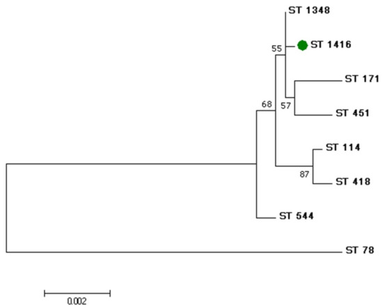 | E. hormaechei strain 1801 c | 78 | 8 | 9 | 6 | 9 | 9 | 6 | 8 | https://pubmlst.org (accessed on 15 May 2022) |
