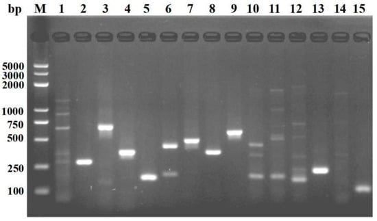 Screening of conventional PCR primers for F. solani where M is a 100 bp DNA ladder; Lanes 1 to 15 are primers FS-1/FS-2, FS-3/FS-4, F1-1/F1-2, F1-3/F1-4, F8-1/F8-2, F8-3/F8-4, F1/F2, F3/F4, F5/F6, F7/F8, F9/F10, F11/F12, F13/F14, F15/F16, and F17/F18.