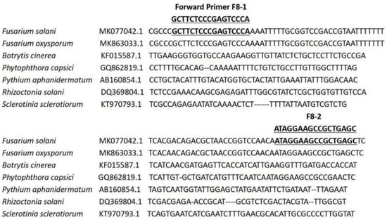 Multiple sequence alignment of the 189 bp EF gene region used as a qPCR target sequence for F. solani. (1) The F. solani strain with accession number MK077042.1; (2) the F. oxysporum strain with accession number MK863033.1; (3) the B. cinerea strain with accession number KF015587.1; (4) the P. capsici strain with accession number GQ862819.1; (5) the P. aphanidermatum strain with accession number AB160854.1; (6) the R. solani strain with accession number DQ369804.1; and (7) the S. sclerotiorum strain with accession number KT970793.1. The primer sequences are indicated (F8-1 is a forward complement and F8-2 is a reverse complement).