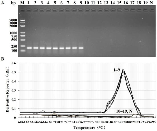 Specific detection of primers F8-1/F8-2 where M is a 100 bp DNA ladder (A), and the melting curve of the qPCR for gradient dilution of the genomic DNA of F. solani (B). Lane 1 is F. solani, Lane 2 is F. oxysporum, Lane 3 is F. equiseti, Lane 4 is F. tricinctum, Lane 5 is F. avenaceum, Lane 6 is F. semitectum, Lane 7 is F. proliferatum, Lane 8 is F. acuminatum, Lane 9 is F. moniliforme, Lane 10 is P. aphanidermatum, Lane 11 is S. sclerotiorum, Lane 12 is P. infestans, Lane 13 is P. capsici, Lane 14 is B. cinerea, Lane 15 is S. solani, Lanes 16–18 are R. solani, Lane 19 is C. cassiicola, and Lane N is the ddH2O blank.