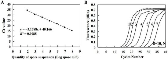 The dilution of F. solani with sterile water in a 10-fold dilution series from 8.2 × 107 to 82 spore mL−1 and subsequent DNA extraction and qPCR were performed as described above. The concentration of each sample was repeated for 3 times to determine the standard deviation (SD) of Ct value. The coefficient of variation (CV) was calculated following a method similar to Chai et al. (2020) []. It is noteworthy that the limitation of quantification was specified as the lowest concentration at which replicates showed a CV ≤ 35% at the calculated concentration [].