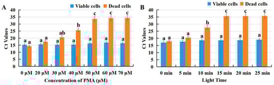 The trend of light time screening and concentration treatment was almost similar. The light time presented no significant difference in the Ct values of viable F. solani cells (p < 0.05) (Figure 5B). The Ct values showed a significant upward trend with PMA exposure time from 0 to 15 min for dead cell suspensions (p < 0.05). When the light exposure time was extended from 15 to 25 min, the Ct value did not change significantly (Figure 5B). Thus, 15 min will be the appropriate exposure time to completely inhibit the DNA amplification of dead cells.