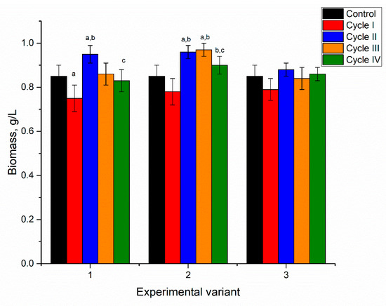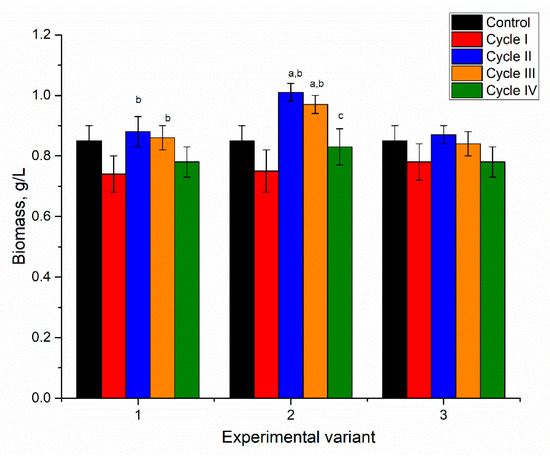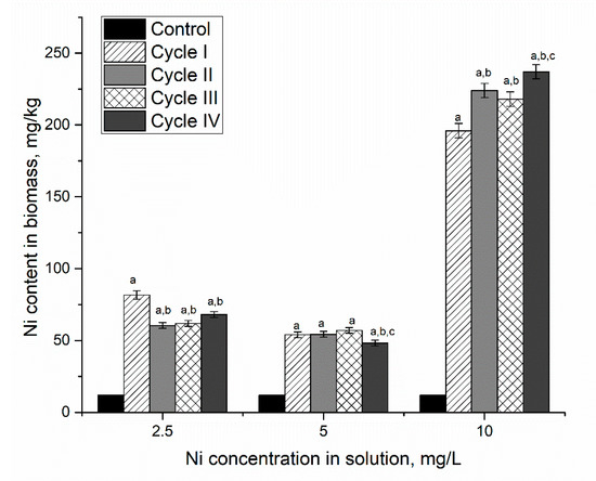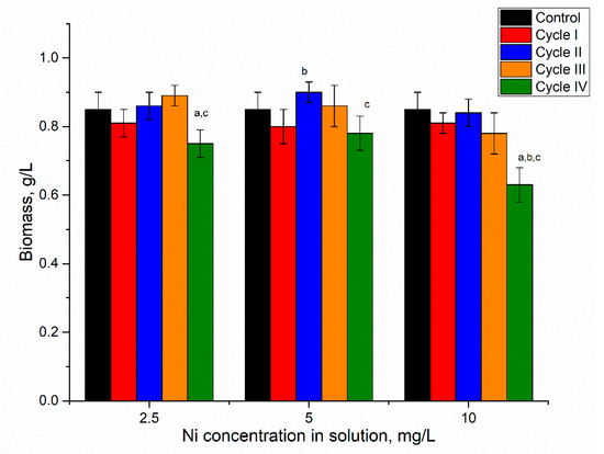 The amount of biomass in spirulina cultivated in a medium containing nickel ions at concentrations of 2.5–10 mg/L during four cycles. a: p < 0.001 for the difference between experimental and control samples; b: p < 0.001 for the difference from the first cycle; c: p < 0.001 for the difference from the second cycle.