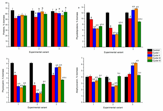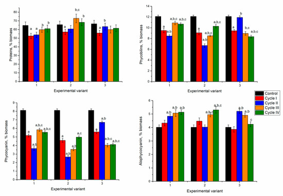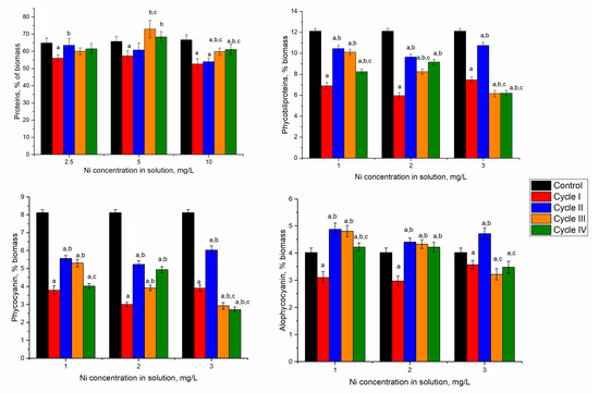 The content of proteins and phycobiliproteins in spirulina biomass cultivated in a medium containing nickel ions at 2.5–10 mg/L over four cycles. a: p < 0.001 for the difference between experimental and control samples; b: p < 0.001 for the difference from the first cycle; c: p < 0.001 for the difference from the second cycle.