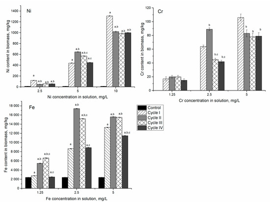 In the Ni/Cr/Fe system at nickel concentration in the solution of 2.5 mg/L, after the first cycle of cultivation, nickel content in biomass was 10 times higher than control (Figure 4). In the next three cycles, its content in biomass decreased approximately twice and was almost on the same level. At nickel concentration in solution 5 mg/L, its content in biomass increased 37–55 times.