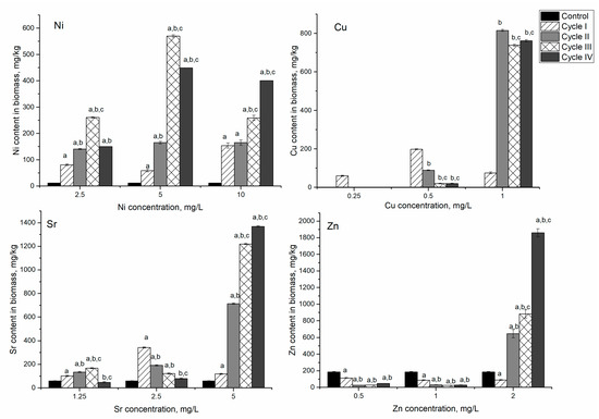 Accumulation of metal ions in spirulina biomass during repeated cultivation in the medium containing metal ions at concentrations: nickel 2.5–10 mg/L, copper 0.5–1 mg/L, strontium—1–5 mg/L, and Zn—0.5–2 mg/L. a: p < 0.001 for the difference between experimental and control samples; b: p < 0.001 for the difference from the first cycle; c: p < 0.001 for the difference from the second cycle.