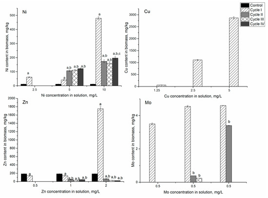 In the third experimental variant, maximum accumulation of all metal ions present in the mixture took place in the first cultivation cycle: 40 times for nickel, 2870 times for copper, 9.4 times for zinc, and 4.6 mg/kg for molybdenum. In the next three cycles, a drastic decrease in metal uptake was noticed. By the fourth cycle, copper and molybdenum were not detected in biomass, zinc content was lower by 88% than in control, while nickel was 17 times. Nickel adversity in microorganisms is mostly due to its ability to interfere with or replace other essential minerals, such as iron, zinc, copper, calcium, magnesium, molybdenum, iodine, potassium, and sodium in cells [33]. The observed reduction of the levels of zinc, copper, and molybdenum in biomass support this fact.