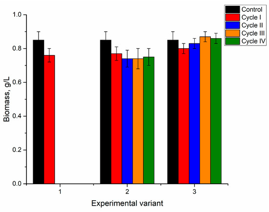 As mentioned previously, in the first experimental variant, the spirulina biomass was able to grow only for one cycle, and the biomass was 12% lower (statistically insignificant) than the control (Figure 11). In this case, a correlation between productivity and the accumulation of metals in biomass cannot be determined. In the second experimental variant, the biomass productivity was lower by 10–13% (statistically insignificant) than in control. The biomass content obtained in the third experimental variant did not appreciably change over the repeated cultivation in a metal loaded medium.