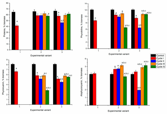 In the first experimental variant, the content of phycobiliproteins decreased insignificantly, by 19% in the first cycle of cultivation and by 39–46% in the next three cycles (Figure 6). The phycocyanin content decreased drastically, by 31–62%, compared to control. The allophycocyanin content did not change significantly. The maximum decrease of 19% took place in the second cycle.