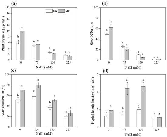 Effects of salinity levels (0, 75, 150, and 225 mM NaCl conditions) and inoculum types (CK and MF inoculated treatment) on plant dry mass (a), shoot K+/Na+ ratio (b), AM fungal colonization rate in root (c), and hyphal length density in soil (d), respectively. Values are mean ± SE (n = 3). Different lowercase letters indicate significant differences between CK and MF. Inoculated treatments were tested using a t-test at 95% confidence level.