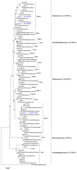 Sequences read with ambiguous nucleotides or those that were lacking a complete barcode and primer were excluded. Chimeric sequences were identified and removed using UCHIME []. Operational taxonomic units (OTUs) with a 97% similarity cutoff were clustered using a searching platform (version 7.0; http://drive5.com/uparse/, accessed on 10 January 2021). For each OTU, the sequence numbers <5 were removed from analysis. The most abundant sequence from each OTU was selected as a representative sequence for that OTU. The taxonomy of representatives from each OTU was checked using the online MaarjAM database (http://www.maarjam.botany.ut.ee/, accessed on 10 January 2021, []) to determine whether these sequences belonged to Glomeromycota. Only sequences confirmed as AM fungi were included in the subsequent analysis. One representative sequence in each OTU clade was blasted against the public databases on the NCBI website to obtain three well-identified reference sequences. The representative sequences of our OTUs and the reference sequences were aligned to create a neighbor-joining (NJ) phylogenetic tree using MEGA software (version 5). The raw sequencing data were deposited to the NCBI sequence read archive (SRA) under the accession number PRJNA739072.