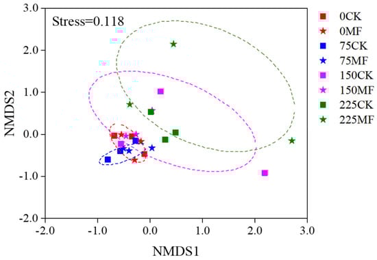 Non-metric multidimensional scaling (NMDS) plot of the AM fungal communities in maize roots under different salinity levels. Red symbols: 0 NaCl, blue symbols: 75 NaCl, purple symbols: 150 NaCl, and green symbols: 225 NaCl. Square: CK, Pentagram: MF inoculated treatment. Ellipses represent 95% confidence intervals around the centroid of all samples.