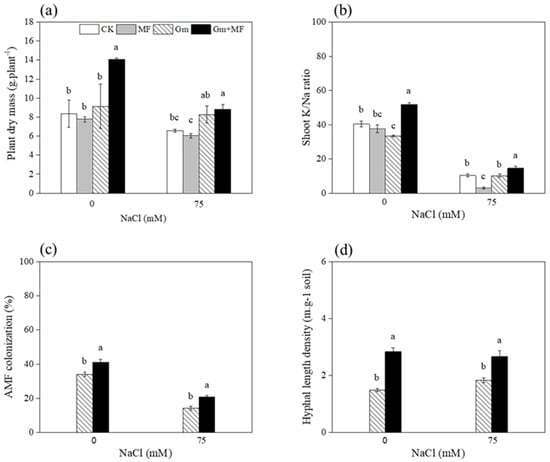Effects of salinity levels (0 and 75 mM NaCl conditions) and inoculum types (CK, MF, Gm, and Gm + MF inoculated treatments) on plant dry mass (a), shoot K+/Na+ ratio (b), AM fungal colonization rate in roots (c), and hyphal length density in soil (d), respectively. Values are mean ± SE (n = 3). Different lowercase letters indicate significant differences of plant dry mass and shoot K+/Na+ ratio among treatments that were tested using Tukey’s honestly significant difference (HSD) test at a 95% confidence level. Significant differences of AM fungal performance between Gm and Gm + MF inoculated treatments were tested using a t-test at 95% confidence level.