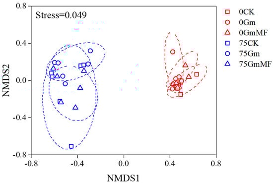Overview of the metabolomic reprogramming in maize plant roots under CK, Gm treatment, and Gm + MF treatment at 0 and 75 mM NaCl conditions. Red symbols: 0 NaCl and blue symbols: 75 NaCl. Square: CK, circle: Gm and triangle: Gm + MF. Ellipses represent 95% confidence intervals around the centroid of all samples.