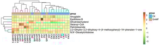 The heat map of differential metabolites accumulated in maize plant roots under un-inoculated and Gm + MF inoculated treatments at 0 and 75 mM NaCl conditions. CK, un-inoculated treatment, GmMF, Gm + MF inoculated treatment. Lower case letters (ck and gmmf) stand for 0 mM NaCl treatment, uppercase letters (CK and GmMF) stand for 75 mM NaCl treatment. n = 6.