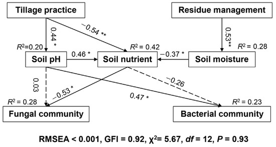 Structural equation models (SEMs) showing the direct and indirect effects of tillage practices and residue retention on soil bacterial and fungal community composition. Values above the line represent the path coefficients. Solid and dashed lines indicate significant and non-significant pathways, respectively (** p < 0.01; * p < 0.05).