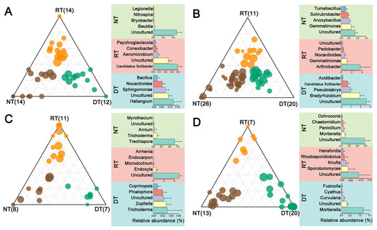 Ternary plots showing the distribution of enriched bacterial OTUs in NT (brown), RT (orange) and DT (green) treatments in 2017 (A) and 2018 (B); the enriched fungal OTUs in the NT, RT and DT treatments in 2017 (C) and 2018 (D). The size of each circle is equivalent to its relative abundance. The most abundant five genera are displayed in bar plots.