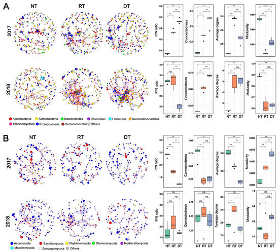 Co-occurrence networks of soil bacterial and fungal communities among treatments (A) positive links/negative links (P/N), average degree, connectedness and modularity of bacterial and fungal networks among treatments. (B) The red and blue lines indicate positive and negative connections between the nodes, respectively. The size of each circle represents the relative abundance of each node. Asterisk indicate significant difference between treatments (** p < 0.01; * p < 0.05) and ns indicate according to Tukey-HSD test. Abbreviations: NT, no tillage; RT, rotary tillage; DT, deep tillage; ns, non-significant.