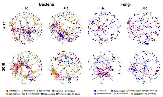 We also constructed soil bacterial and fungal co-occurrence networks in the −R and +R treatments, respectively (Figure 6). In 2017, the shift in bacterial and fungal network structure was not apparent. In contrast, the residue retention decreased both the bacterial and fungal network complexity and connectivity in 2018, supported by the decrease in average degree and connectedness (Figure 6, Supplementary Materials Table S5). Additionally, residue retention increased the P/N ratio in bacterial network, while it decreased in the fungal network in 2018 (Supplementary Materials Table S5).