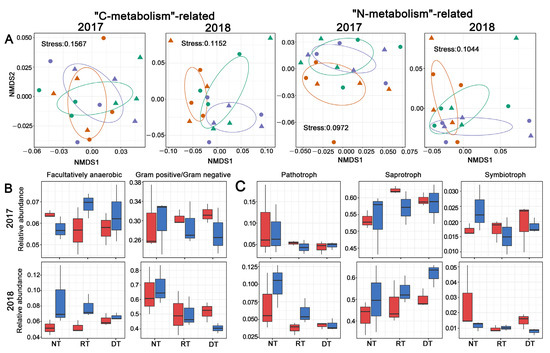 A predicted metagenome was constructed for each sample from the 16S rDNA sequencing data by analysis of the raw OTU copy number using PICRUSt. The most abundant Kyoto Encyclopedia of Genes and Genomes (KEGG) pathways related to the “metabolism” category. Furthermore, a PERMANOVA analysis revealed that the tillage practice significantly influenced the bacterial community’s composition upon “carbon metabolism” and marginally affected the “nitrogen metabolism”-related bacterial community’s composition in 2018 but not in 2017 (Figure 7A, Supplementary Materials Table S6). Using BugBase, we predicted nine potential bacterial phenotypes including aerobic, anaerobic, those containing mobile elements, facultatively anaerobic, biofilm forming, Gram-negative (G−), Gram-positive (G+), potentially pathogenic and stress tolerant. Among these phenotypes, the relative abundance of facultative anaerobic bacteria significantly increased following residue retention, and the G+/G− ratio significantly decreased along with the tillage intensity (Figure 7B, Supplementary Materials Table S7). The soil fungal community was assessed in terms of fungal guilds, and 45.5% of the fungal OTUs were assigned to a fungal guild. In 2018, the relative abundance of pathotrophs decreased significantly in ST compared with NT (Figure 7C, Table S7). However, symbiotrophs and saprotrophs were unaffected by tillage practices and residue retention in both years (Figure 7C, Supplementary Materials Table S7).
