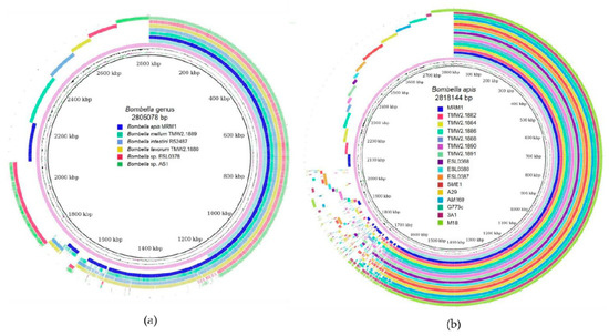 BRIG output image based on the nucleotide sequences of (a) Bombella species and (b) Bombella apis strains. (█) pan genome; (█) core genome.
