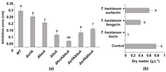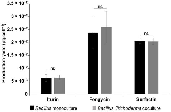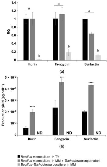 T. harzianum IHEM5437 in MM engendered an inhibition of the production of the bacterial lipopeptides through the repression of the expression of the respective synthetase genes. Examples in the literature have shown different production profiles of lipopeptides by
