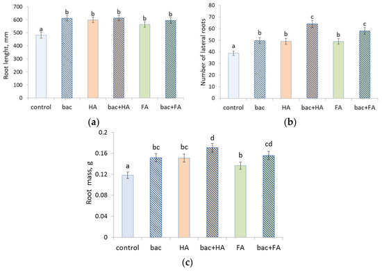 Total length of all seminal roots (a), number of lateral roots (b), and root mass (c) of wheat plants 7 days after treatment with Pseudomonas plecoglossicida 2,4-D (bac), humic (HA), and fulvic (FA) acids, and their combinations (bac + HA and bac + FA). Means statistically significant difference from each other are indicated by different letters, p ≤ 0.05, n = 15 (ANOVA followed by Duncan’s test).